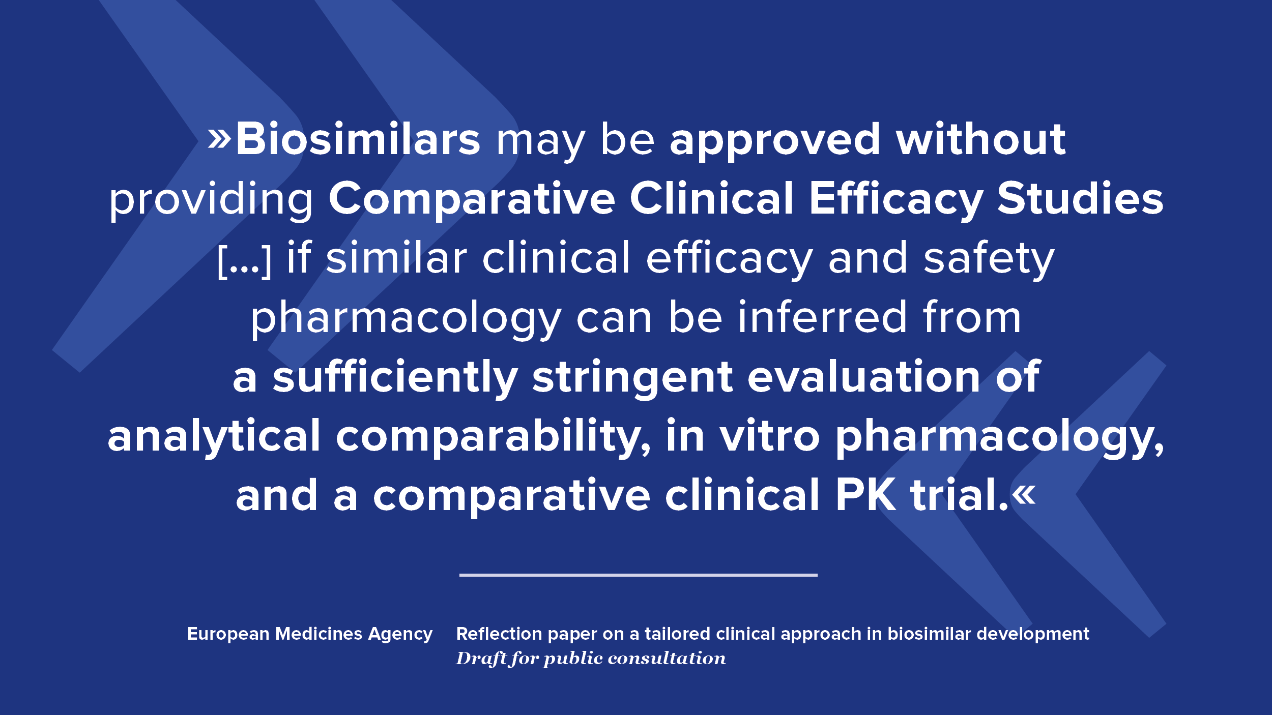 Gemäß dem Entwurf der EMA sind PK-Studien (Phase-I-Studien) in Bezug auf die klinische Entwicklung in aller Regel ausreichend für die Zulassung eines Biosimilars. CES-Studien (Phase-III-Studien) können weiterhin dann erforderlich sein, wenn eine „biologische Substanz nicht gut charakterisierbar ist und/oder einen unbekannten oder unzureichend verstandenen Wirkmechanismus / Struktur-Funktions-Beziehung aufweist oder wenn die Auswirkungen von beobachteten Unterschieden auf die klinischen Ergebnisse unklar sind“.